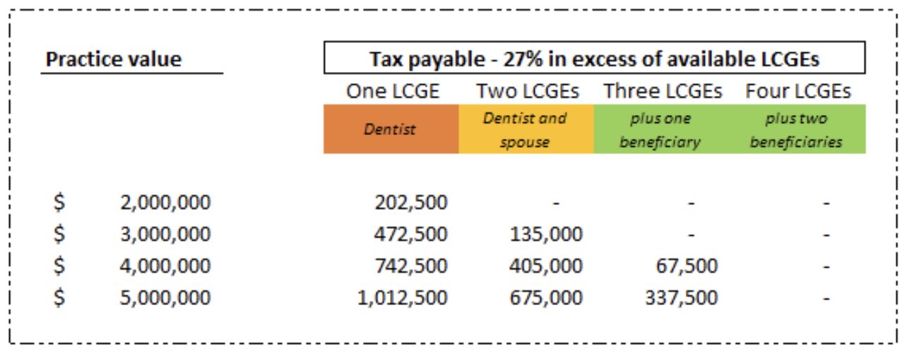 Currently, the lifetime capital gains exemption (“LCGE”) is $1,250,000 per individual and is indexed for inflation, meaning the future savings are even more. The amount you save depends on the value of the practice and the number of family members included in your family trust, each having access to the lifetime capital gains exemption. Here’s an illustration: